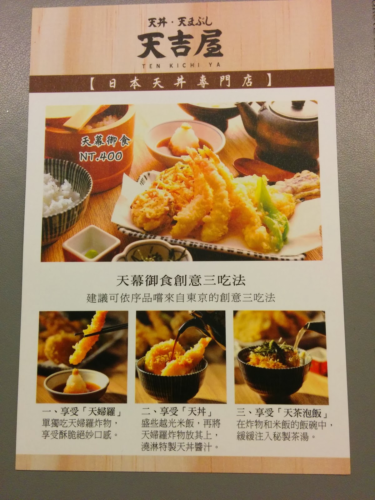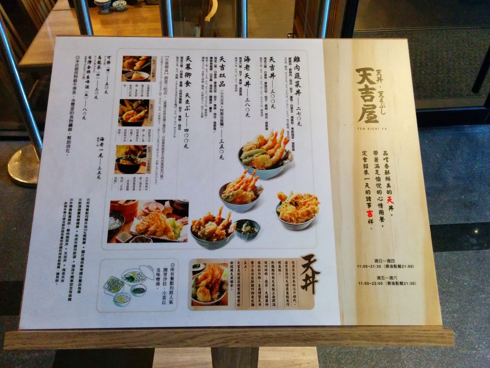 天吉屋主要提供 雞肉蔬菜丼、天吉丼、海老天丼、天吉雙品 及 天幕御食 等,五種天丼。