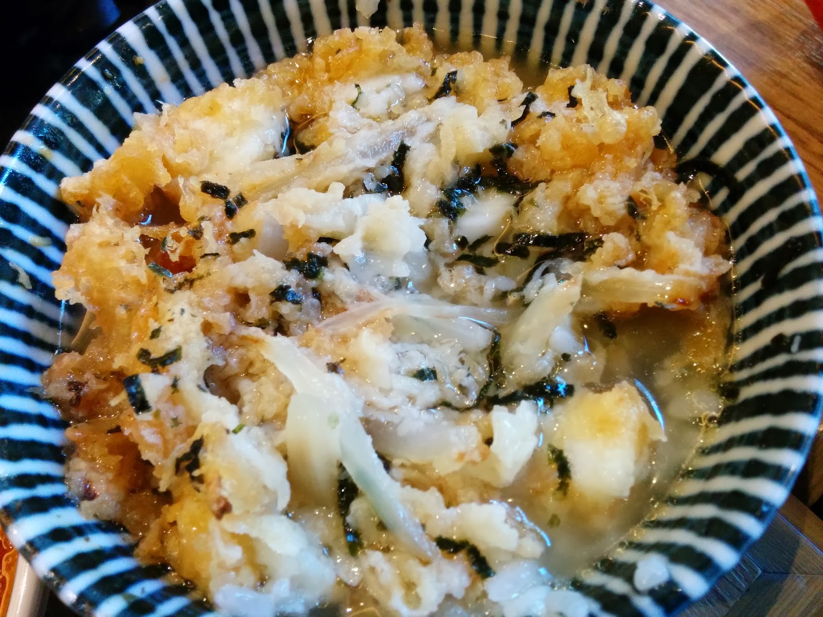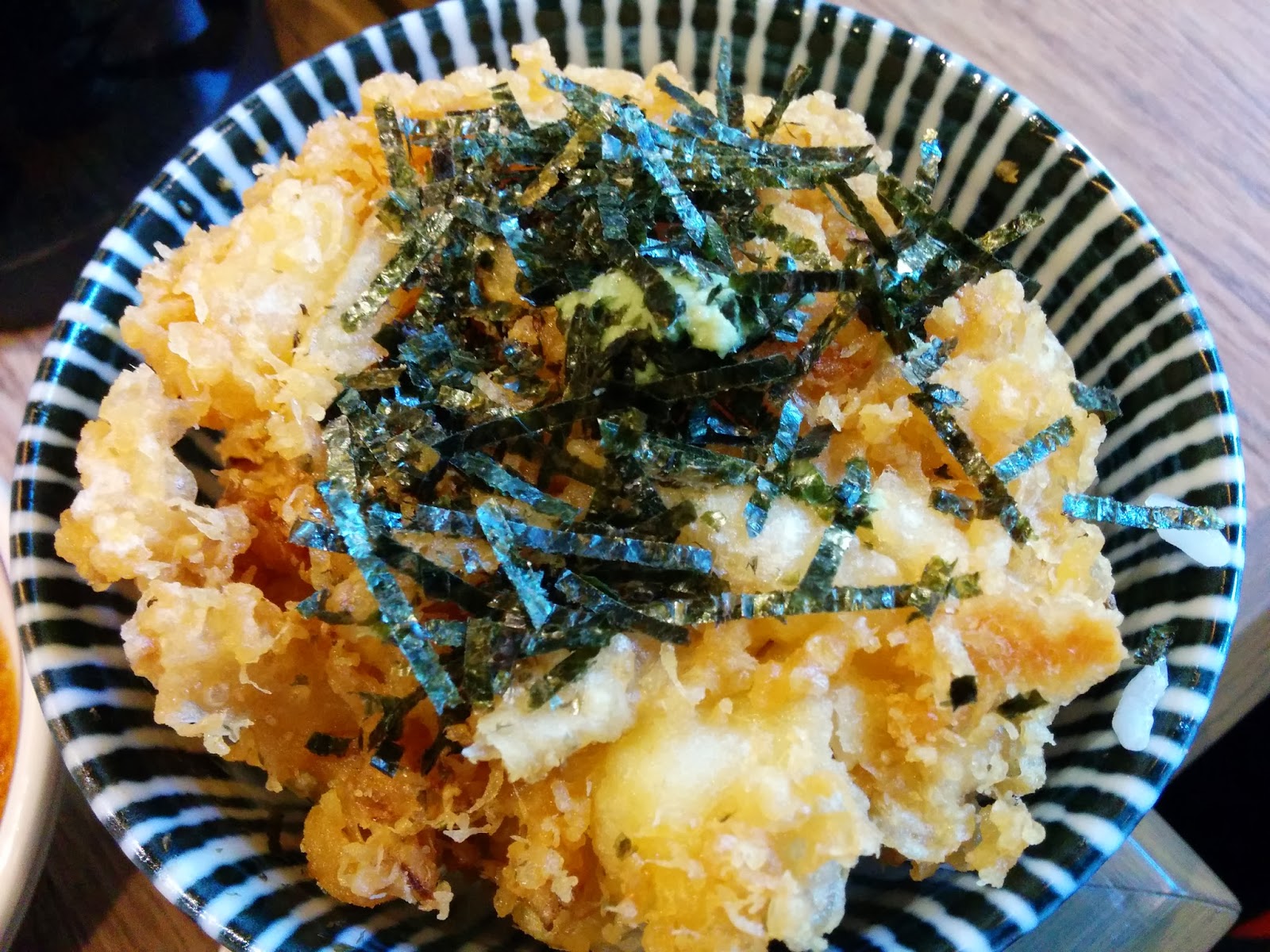 放上炸花枝天婦羅(店員推薦的),撒些海苔,加上芥末。