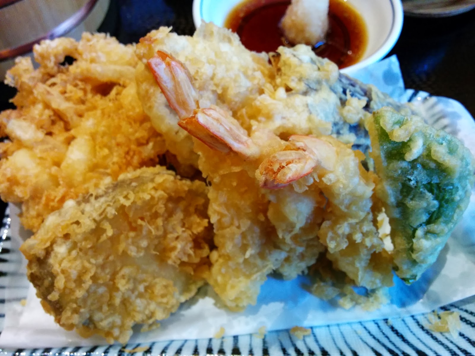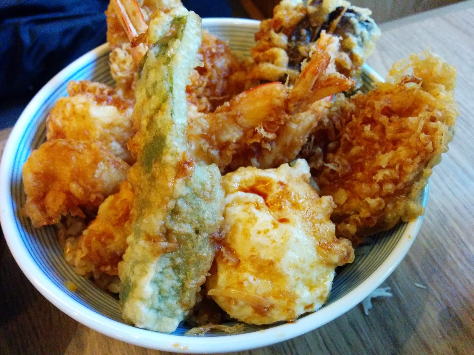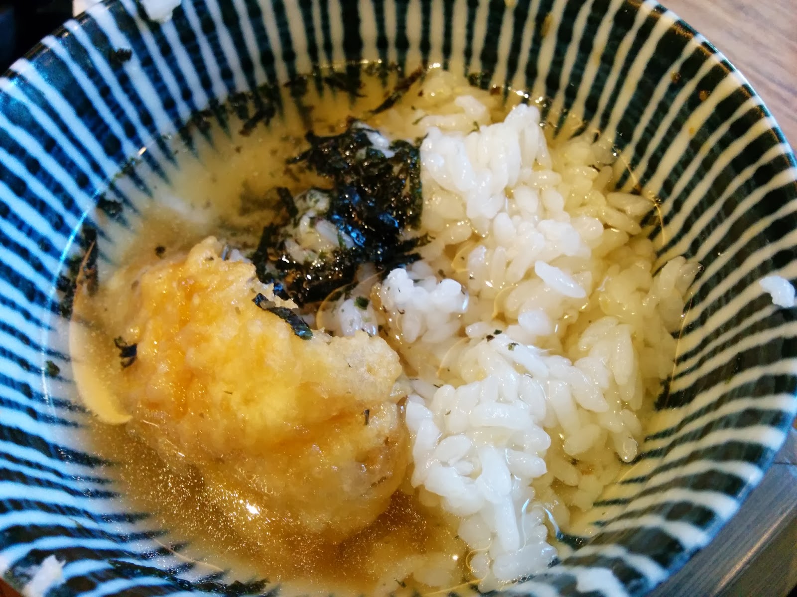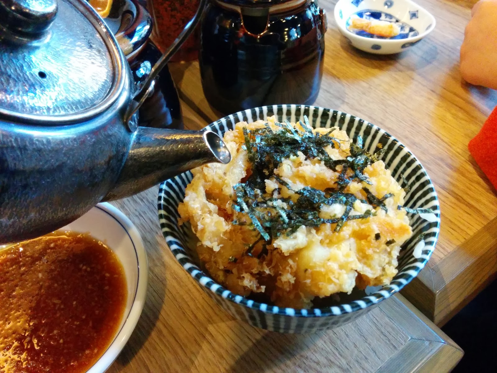 盛上一些越光米飯,加上一些炸物,淋上天婦羅醬。