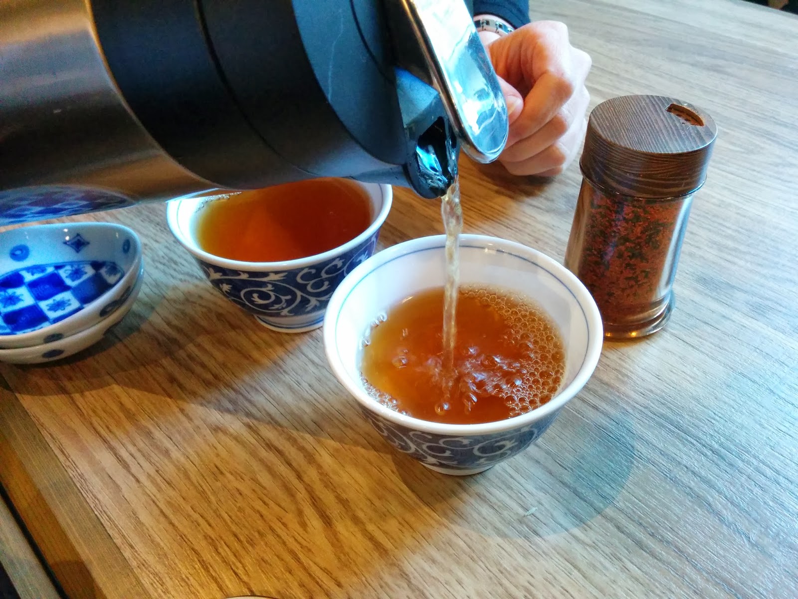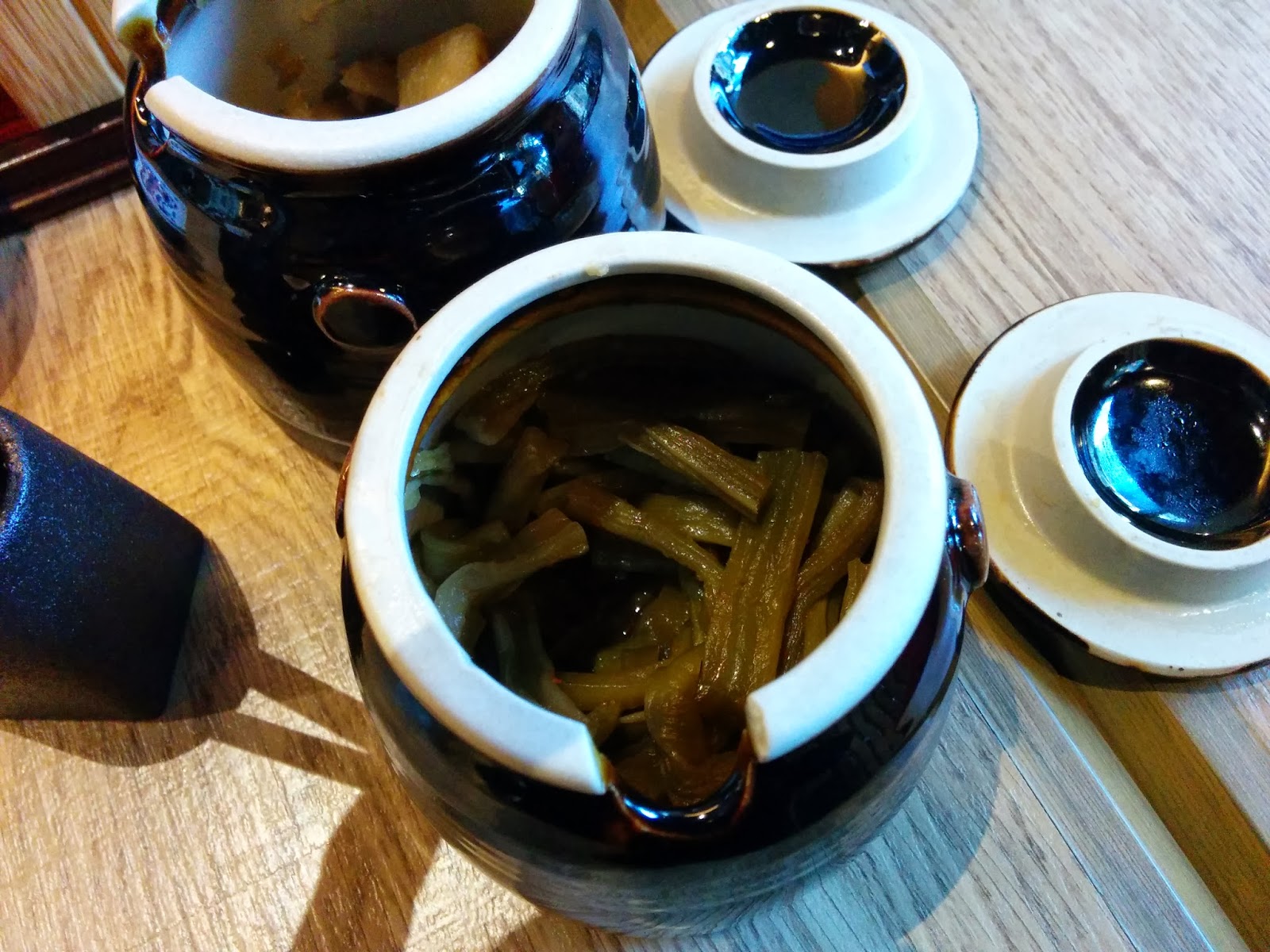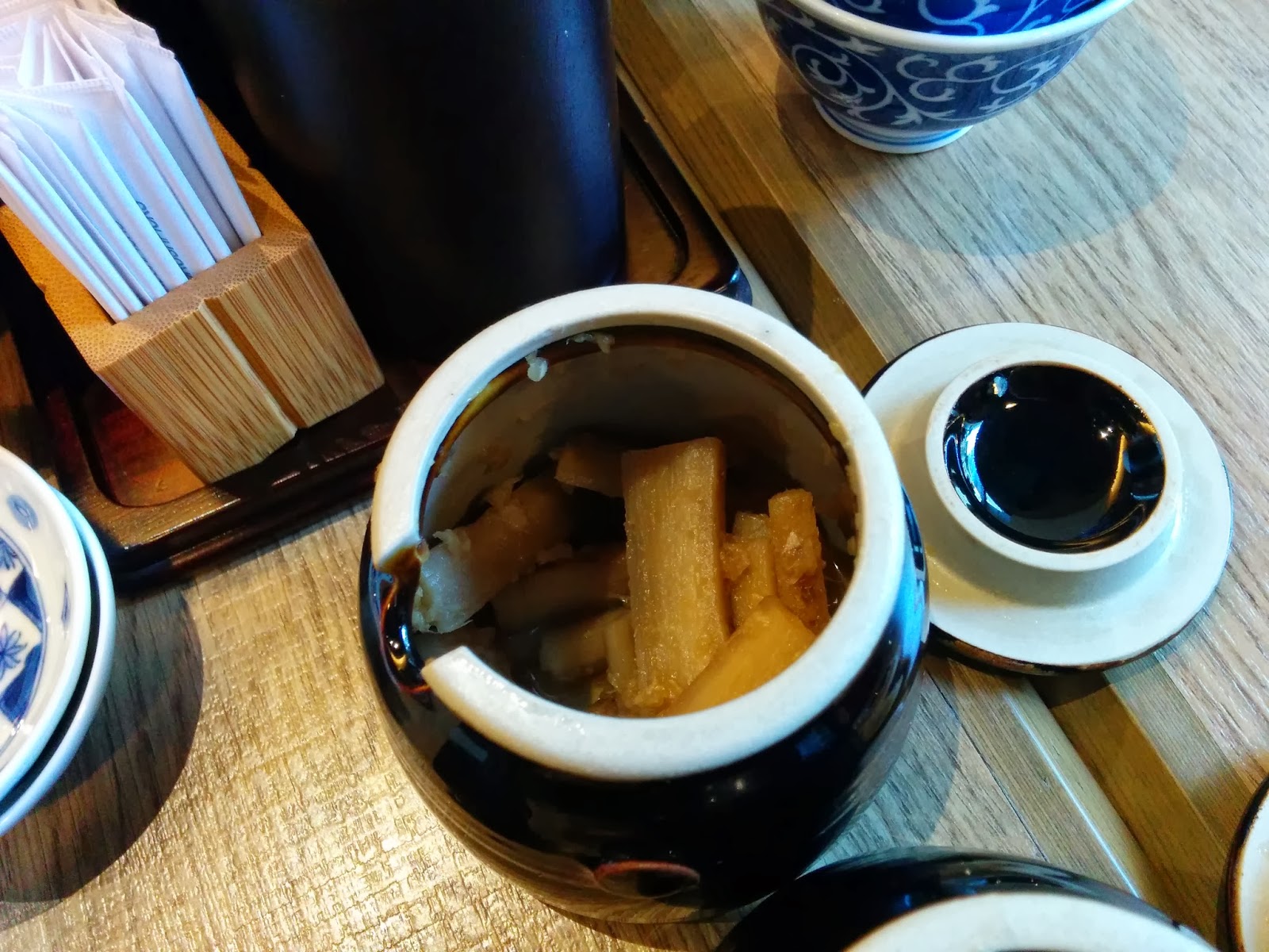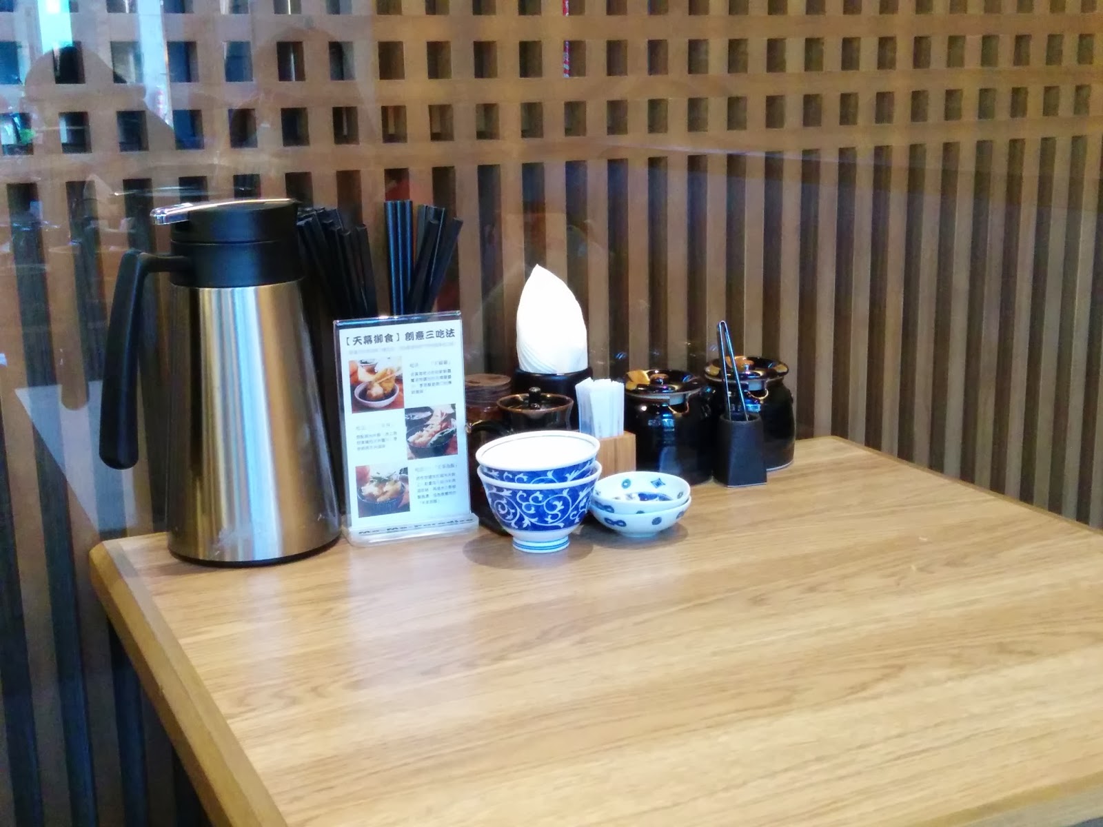 桌上擺放著餐具、天婦羅醬、熱茶(茶壺內裝的是熱牛蒡茶)、及兩瓶醬菜可自由取用。