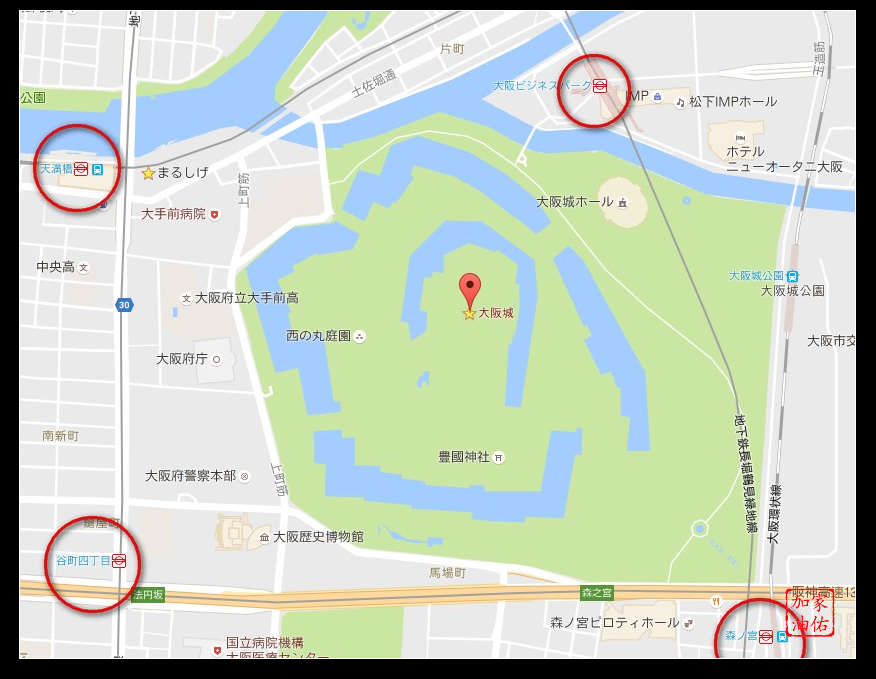 大阪城天守閣周遭總共有四個車站,地圖上距離都差不了太多,今天是用大阪市營地鐵一日券,就搭乘地鐵到谷町線跟中央線匯集的谷町四丁目站下車。