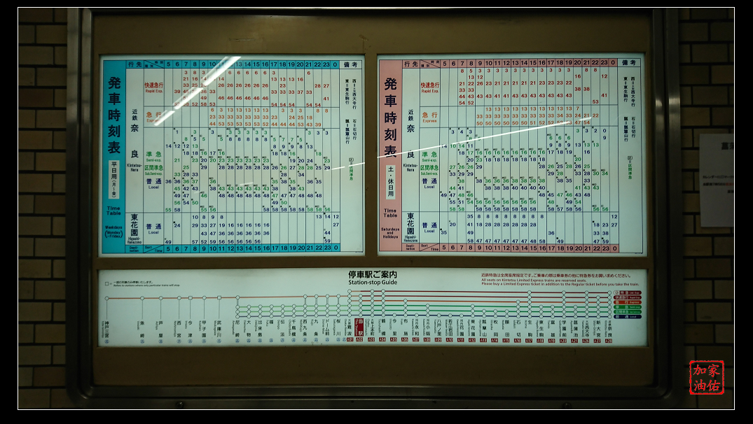 到達日本橋站的近鐵奈良線,可以看到發車時刻表及各種車型停靠站,近鐵奈良是終點線,所以只要不要坐錯方向都可以到終點。可以搭到特急或是快速急行的話,到達的時間可以早很多。