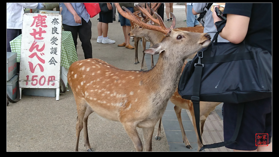 一出車站,因為時間才九點多,直接往東大寺方向前進,走不到五分鐘進入奈良公園的範圍,路邊已經有開始賣鹿餅乾的攤位及一群搶食的鹿。